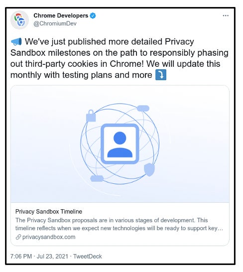 Late on Friday, July 23, Google launched a dedicated website with a more detailed running timeline, which it plans to update every month. It announced the website’s launch via tweet rather than blog or press release. (You’d be forgiven for missing the news if you don’t already follow the Chrome Developers Twitter account.)