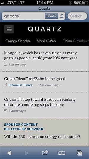 An early example of this was the September launch of Atlantic Media’s Quartz (left), a digital-only business media property built specifically for the mobile web that has already reached 1.4 million unique visitors.
