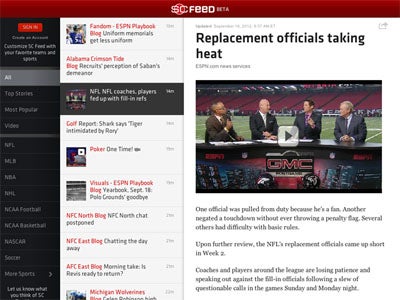 The stream-formatted approach to content presentation is also starting to make its way on to traditional digital media websites like ESPN, which launched the beta of its SportsCenter Feed in September (below). ESPN, which has traditionally been an early adopter of digital technologies and experiences, is taking a similar approach to Quartz in delivering a real-time, ad-supported, news feed with the added capability to consume subsets of the stream via content-specific tabs — as well as the ability to add skins to the background that further promote the content sponsor.